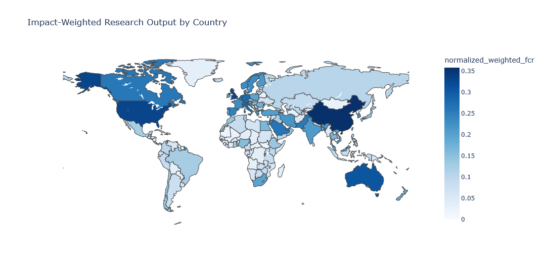 Figure 1. Global distribution of the Impact-Weighted Research Output metric. Darker blue indicates higher normalized weighted FCR.