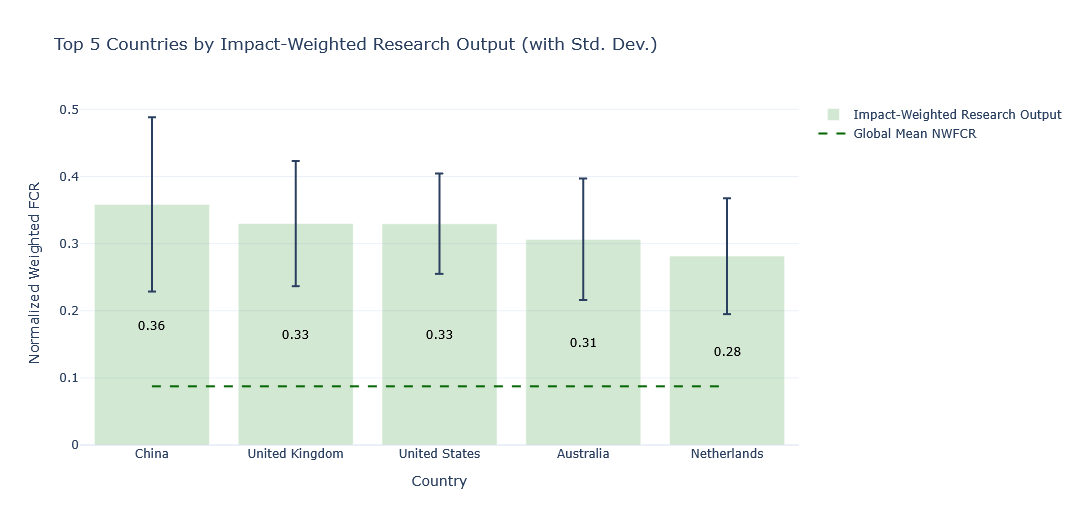 Figure 2. Top 5 countries by Impact-Weighted Research Output with standard deviation error bars. The dashed green line marks the global mean.