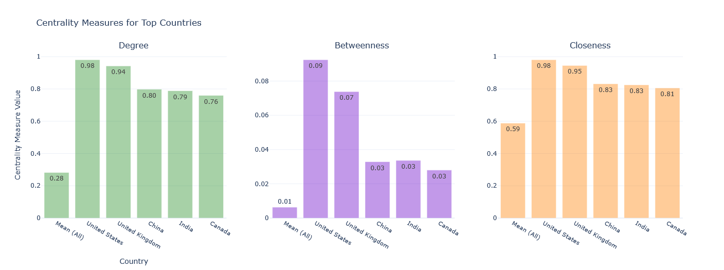 Figure 4. Centrality measures for the top 5 countries compared to the network mean. The US and UK lead across all three measures by a wide margin.