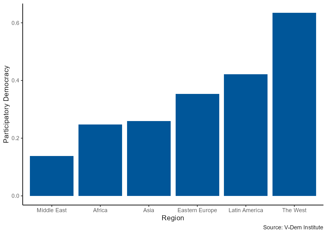 The regional pattern in the 2000–2022 bar chart summary is stark: the West records the highest average years of education and the lowest educational inequality alongside the strongest participatory democracy scores. Africa records the inverse across all three variables. The Middle East records the lowest participatory democracy scores in the dataset.