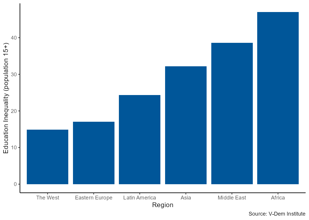 - African countries have the highest educational inequality and the lowest participatory democracy scores while the Middle East has the lowest scores on participatory democracy.