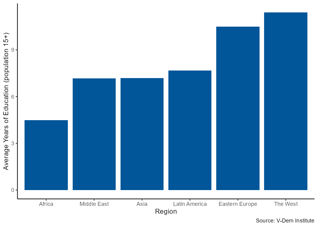 Interpretation: The three regional bar charts tell a consistent story – the West leads on all three variables (highest education years, lowest inequality, strongest democracy) while Africa shows the inverse. The Middle East records the lowest participatory democracy scores despite moderate education levels, suggesting that educational equity alone is insufficient without accompanying legal and institutional protections for political participation.