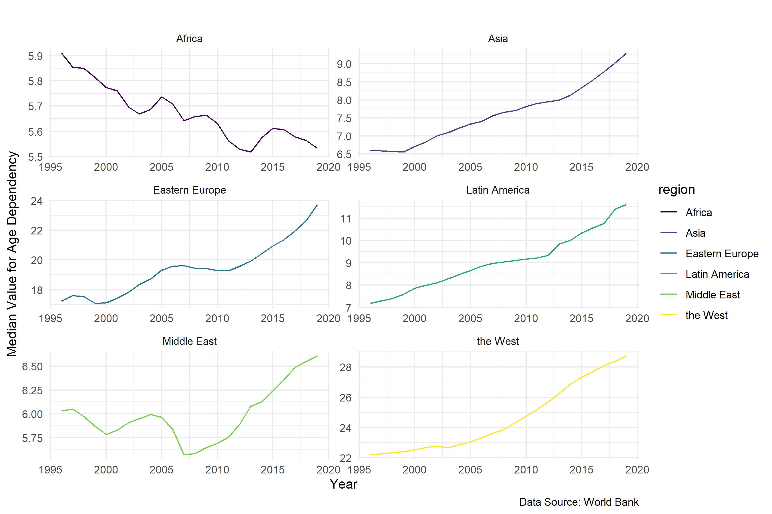 Figure 1. Trends in old age dependency by region, 1996–2019.