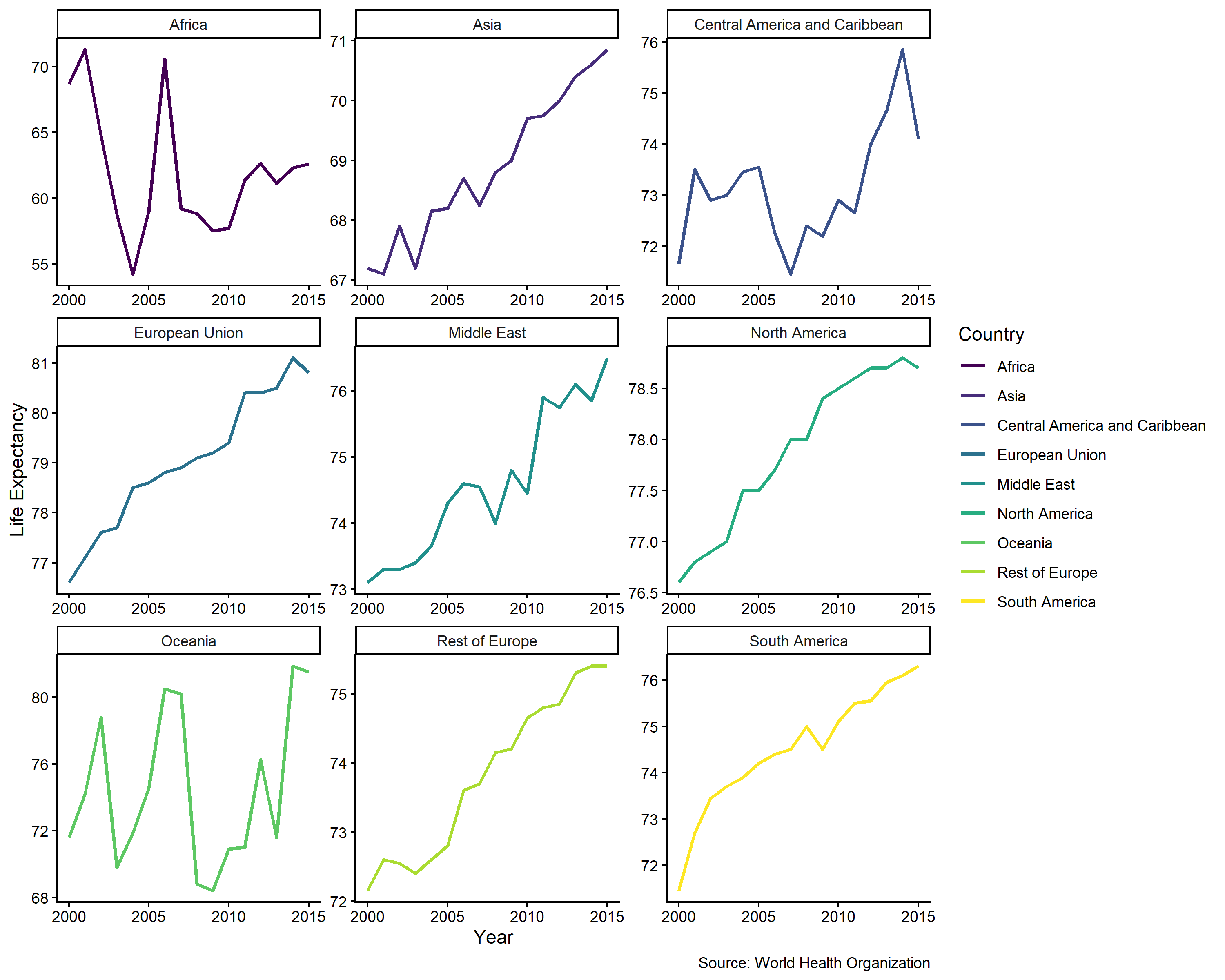 Life expectancy varied substantially across regions from 2000 to 2015. The time series below shows that even high-income regions experienced mid-decade declines, pointing to systemic vulnerabilities in health system capacity rather than country-specific shocks.