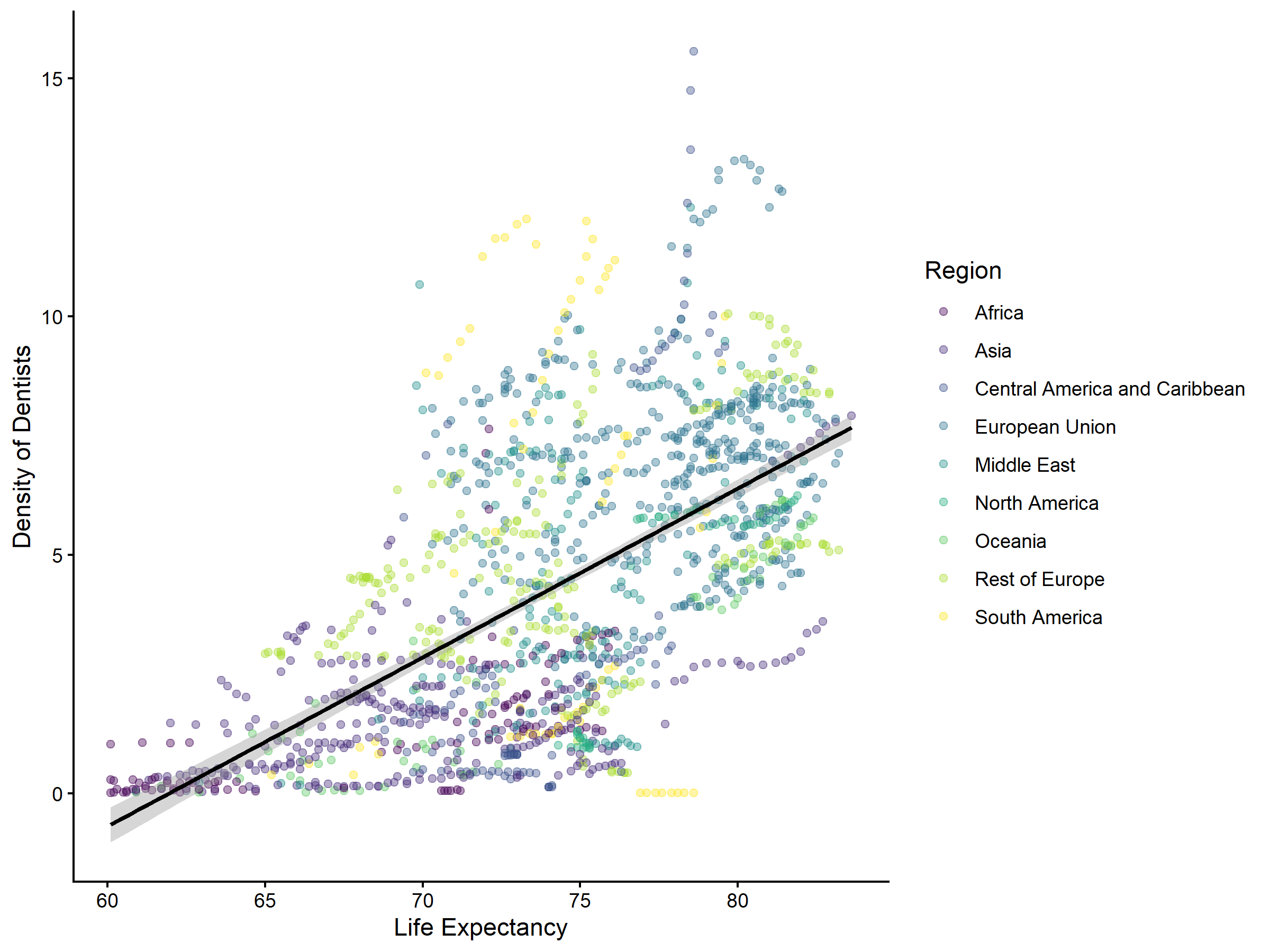 Figure 2. Dentist density and life expectancy (countries with life expectancy >= 60 years).