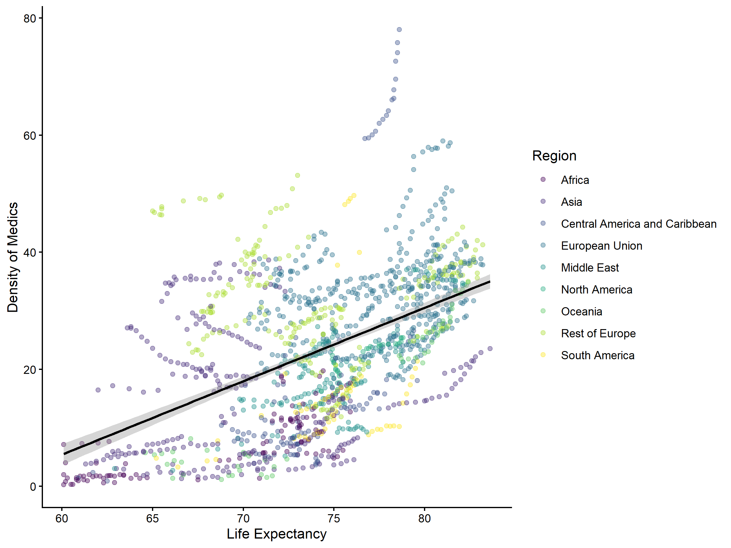 Figure 3. Medic density and life expectancy (countries with life expectancy >= 60 years).