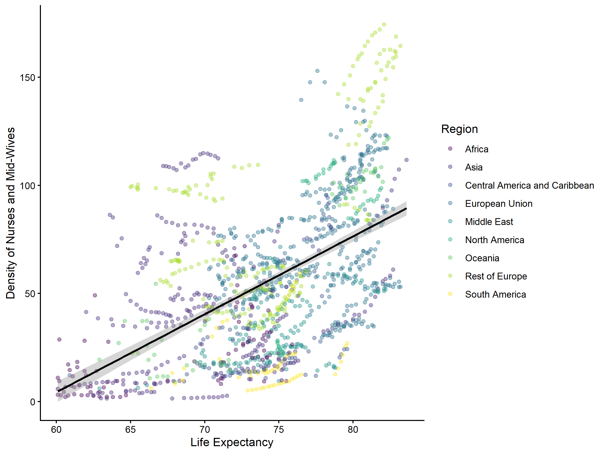 Figure 4. Nurse and midwifery density and life expectancy (countries with life expectancy >= 60 years).