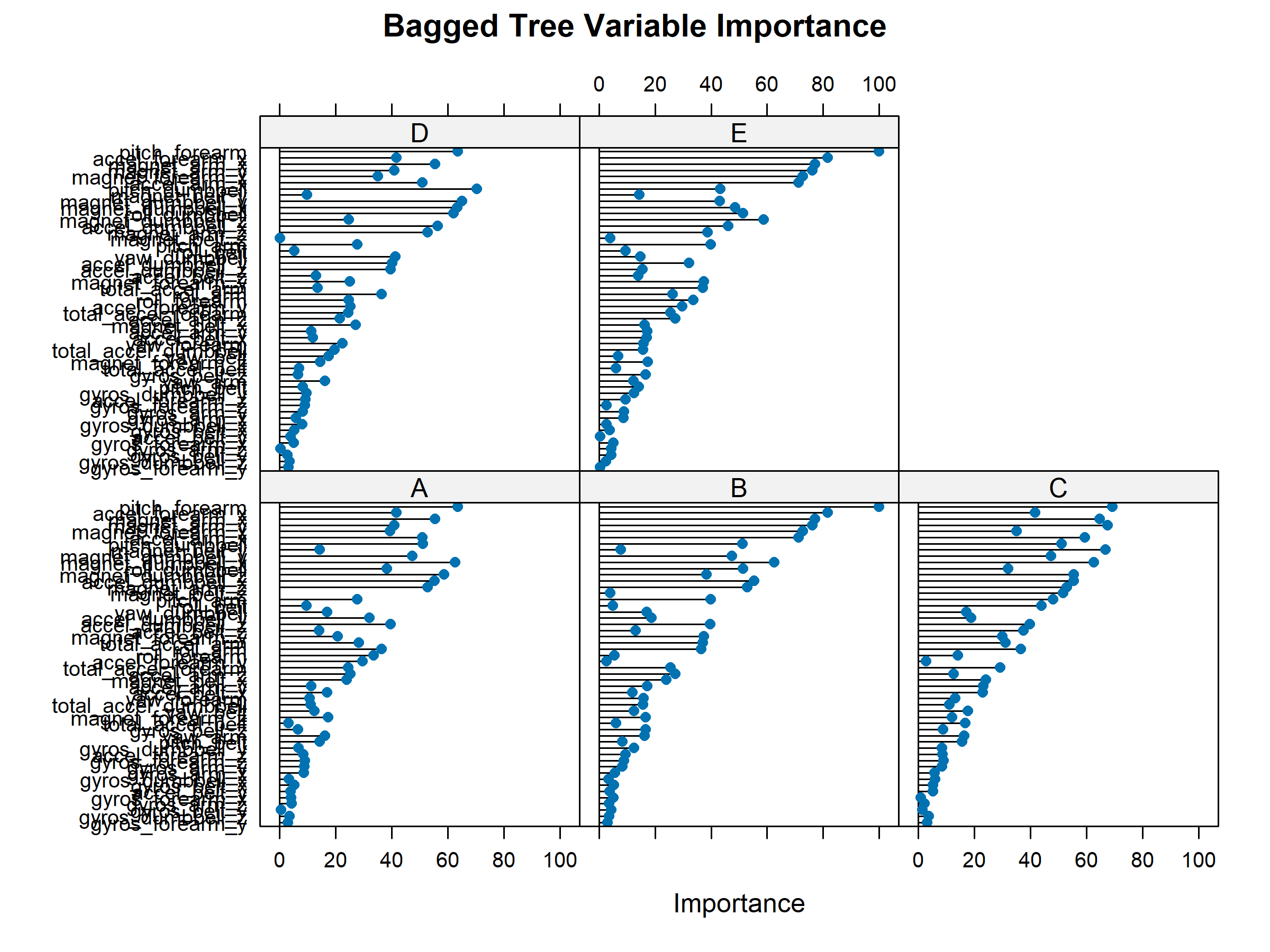 - Four models trained using the caret package with 5-fold cross-validation via trainControl: decision tree (rpart), bagged decision tree (bag), gradient boosted random forest (gbm), and random forest (rf).