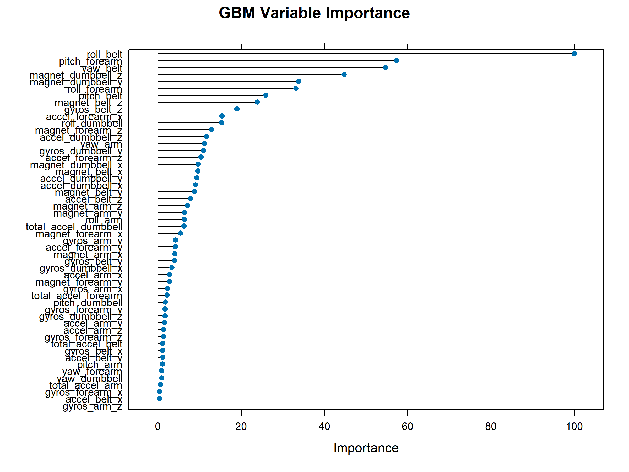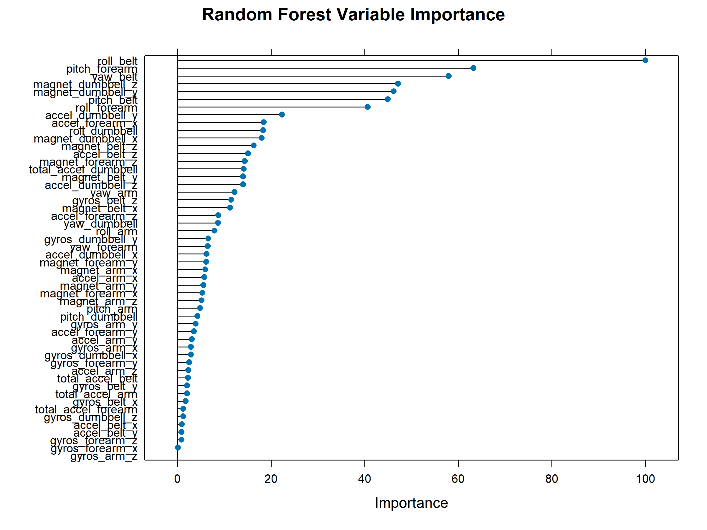 Interpretation: Variable importance identifies the sensor readings most responsible for accurate classification. Accuracy peaks at 27 of 52 predictors – the model does not benefit from the full predictor set. Collinear predictors may be inflating apparent accuracy; weighting or removing correlated variables is a recommended next step. Domain expertise in exercise physiology would be valuable in determining which of the top predictors reflect biomechanically meaningful signals.