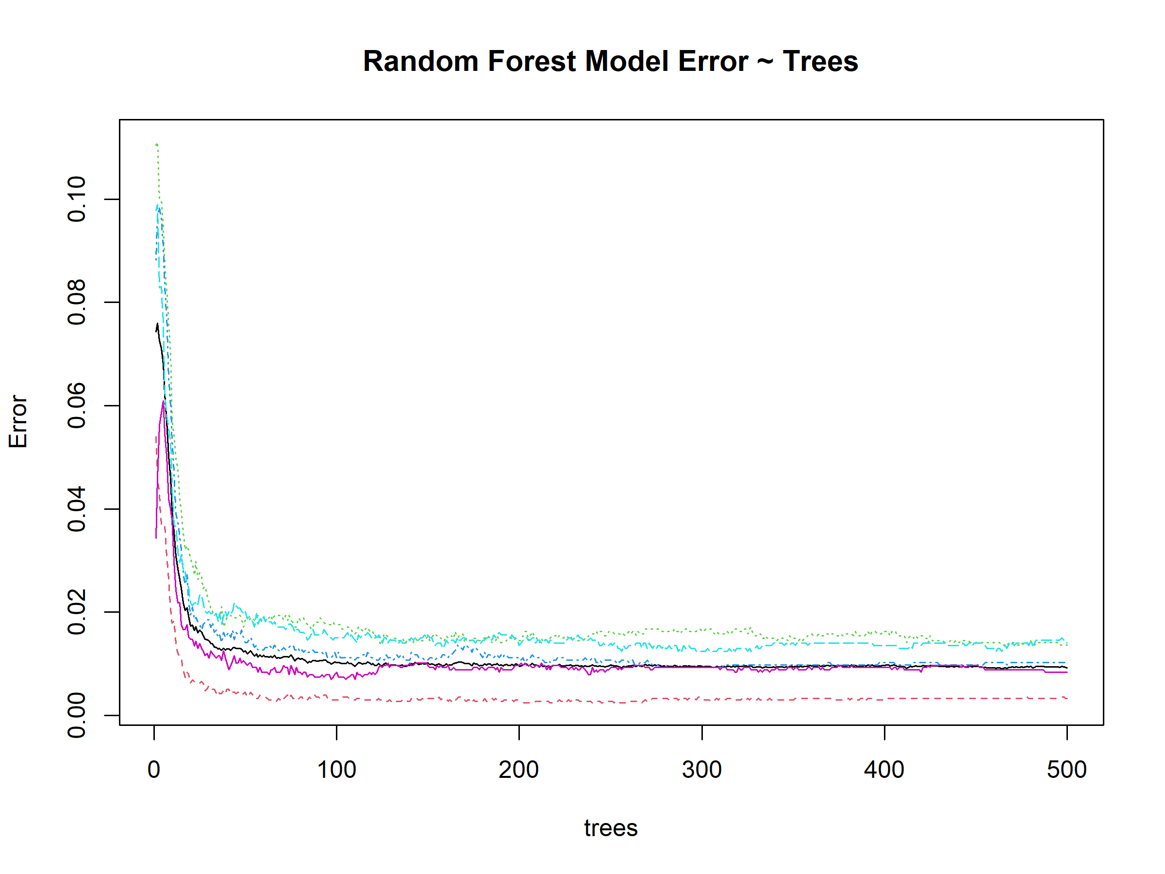 Interpretation: Model error declines rapidly through the first 100 trees and stabilizes around 200, indicating convergence. Each line represents one of the five form classes (A–E). The plateau after ~200 trees confirms that additional trees do not improve performance and that a smaller forest could be used in a leaner deployment.