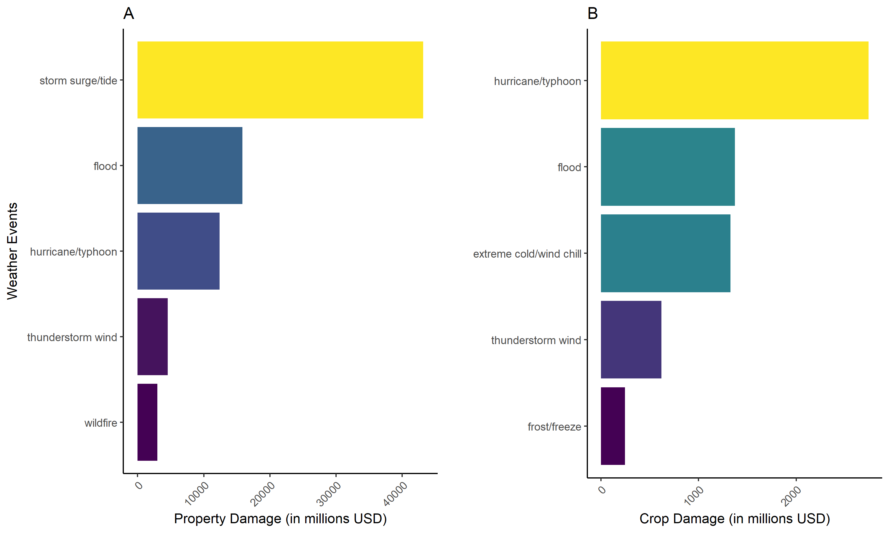 Storm surge/tide is the leading cause of property damage by a substantial margin (Figure 2A) – roughly 2.5x the property damage caused by floods, which rank second. Hurricane/typhoon ranks third, followed by thunderstorm wind and wildfire. The crop damage ranking tells a different story (Figure 2B): hurricane/typhoon leads, followed by flood, extreme cold/wind chill, thunderstorm wind, and frost/freeze. The appearance of extreme cold/wind chill and frost/freeze in the crop damage top five – but not the property damage top five – reflects the distinct agricultural exposure of interior states to temperature extremes.