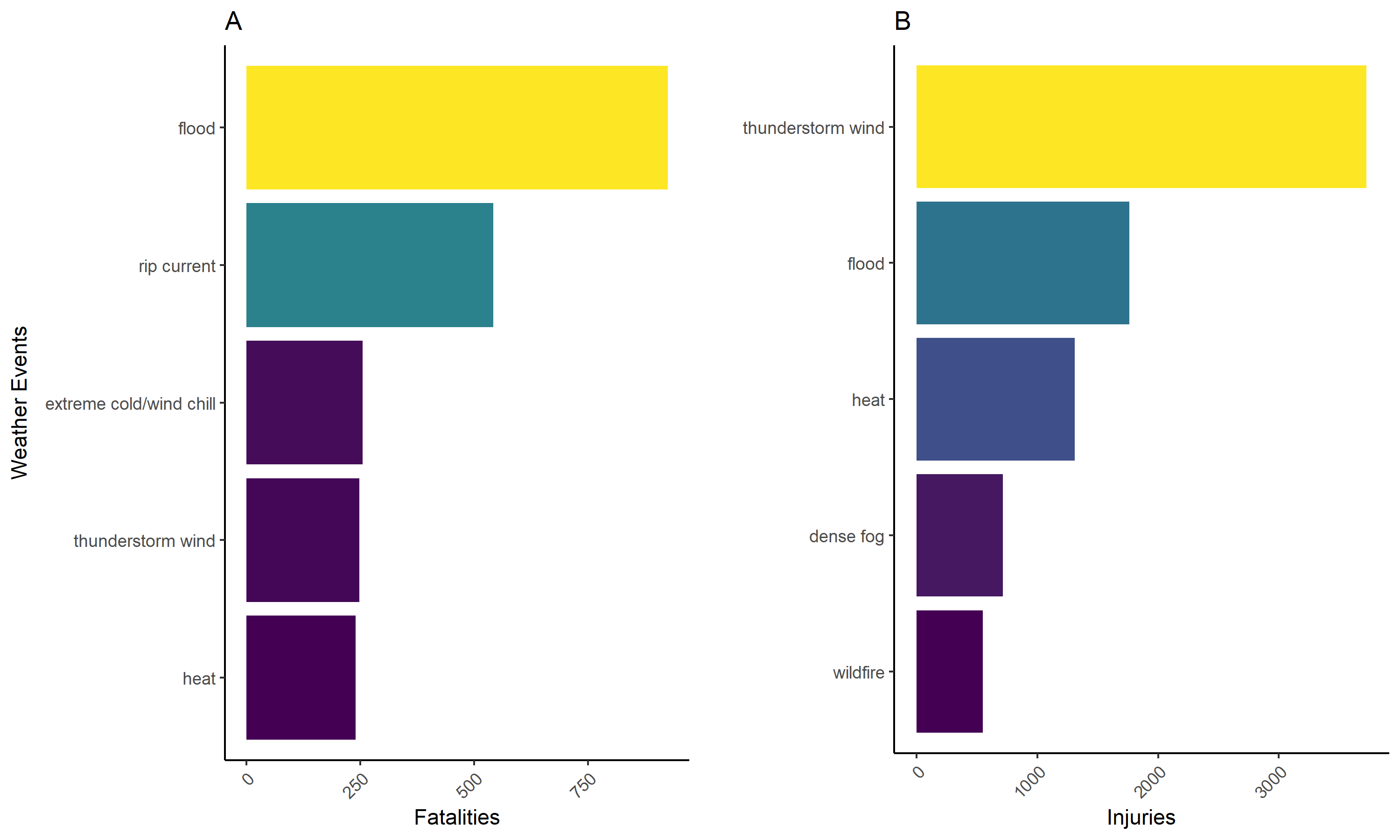 Interpretation: The divergence between the fatality and injury rankings is analytically important. Rip currents rank second for fatalities but do not appear in the injury top five, suggesting high lethality relative to incidence. Dense fog and wildfire appear in the injury rankings but not the fatality rankings, reflecting high injury rates with lower but not negligible mortality. Thunderstorm wind’s dominance in injuries – driven in part by the very high event frequency – would not be visible without the tstm wind correction applied in data processing.
