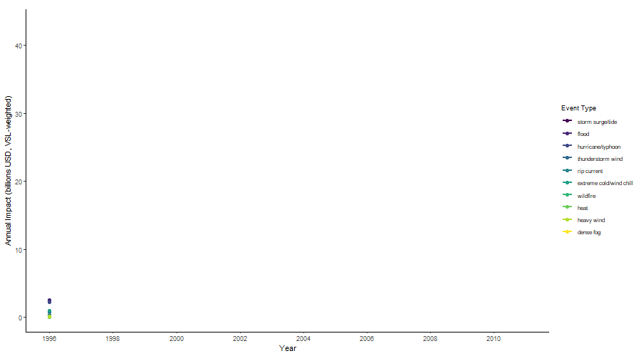 The animation below shows annual VSL-weighted impact for the top 10 event types across the study period. Event impacts are not evenly distributed across years – major storm seasons (particularly 2004–2005, which included multiple catastrophic Atlantic hurricanes, and 2008, which included Hurricane Ike) produce sharp spikes for storm surge/tide and hurricane/typhoon that dwarf other years. Flood impact is more consistently distributed across years, reflecting its broader geographic and seasonal occurrence.