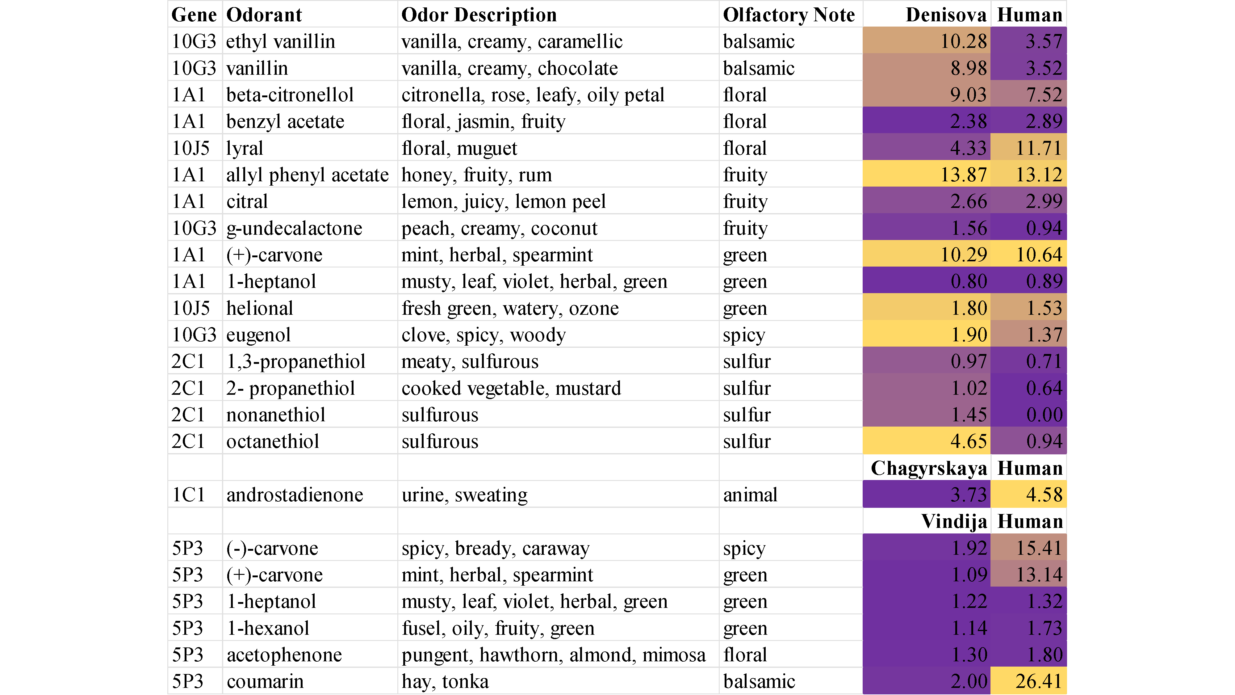 Interpretation: Color coding from low (purple) to high (mustard) highlights the elevated Denisovan responses to balsamic, sweet, and sulfurous odor classes relative to contemporary humans. The Denisovan heightened sensitivity to sweet odors may reflect evolutionary tuning to energy-dense foods – honey and vanilla-associated compounds are among the strongest responses. Neanderthal activity indexes are generally lower than human equivalents across tested odors, consistent with the reduced functional sensitivity seen in the regression analysis.