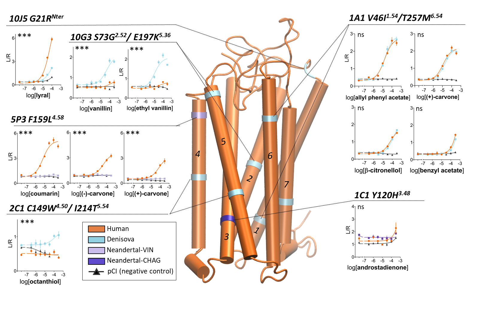 Interpretation: Each colored ring on the transmembrane model marks the location of a novel variant, color-coded by lineage (orange = human, blue = Denisovan, light purple = Vindija Neanderthal, dark purple = Chagyrskaya Neanderthal). Dose-response panels show OR activation (luciferase/renilla ratio) across seven odorant concentrations. Statistical significance between human and ancient lineage versions is shown (*** p<0.001, ** p<0.01, * p<0.05, ns = non-significant). Variants near conserved activation residues tend to reduce function; variants near the binding cavity tend to increase sensitivity.