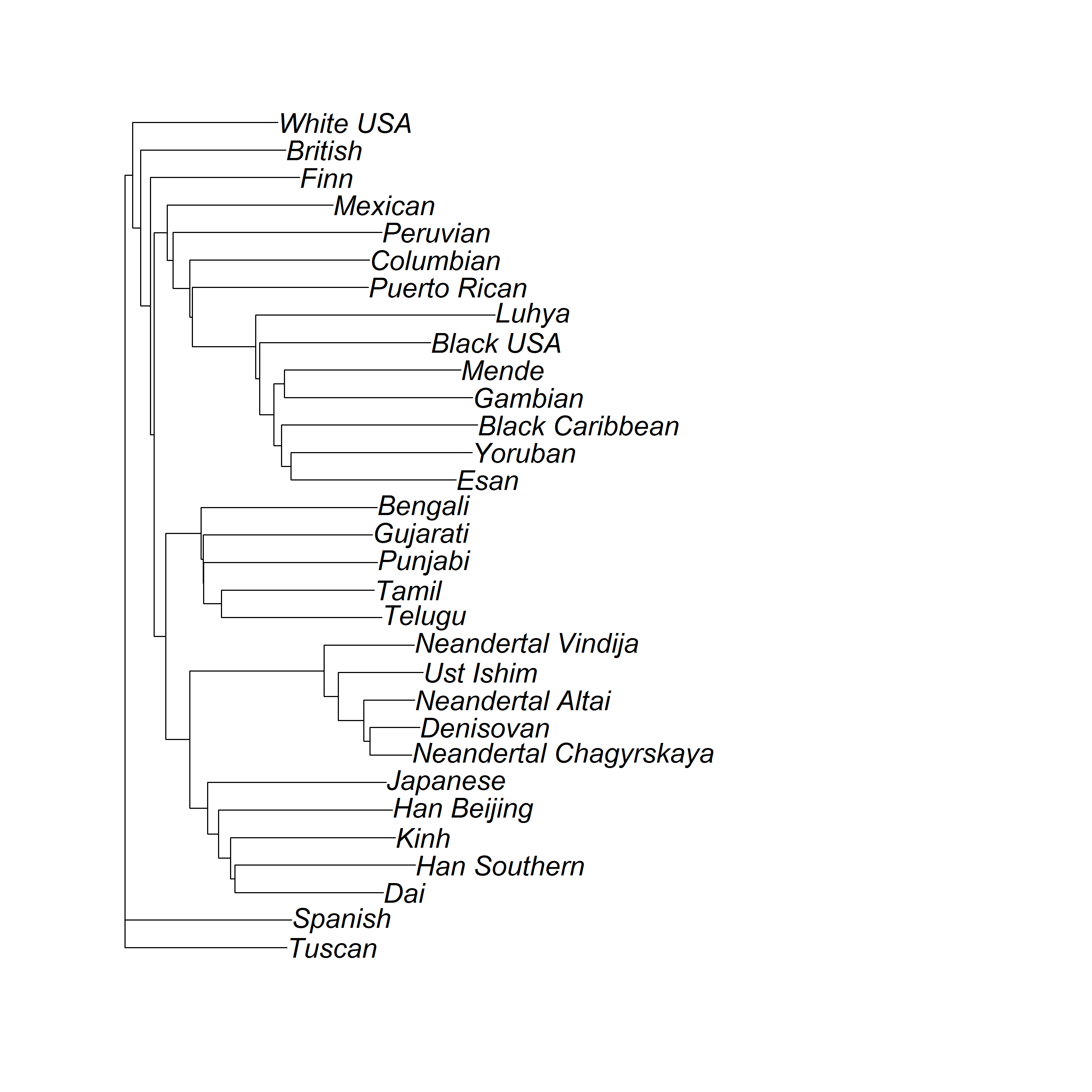 - Inferred phylogenetic relationships across populations using concatenated amino acid sequences for all 30 genes; constructed neighbor-joining tree using ape, seqinr, and phylogram