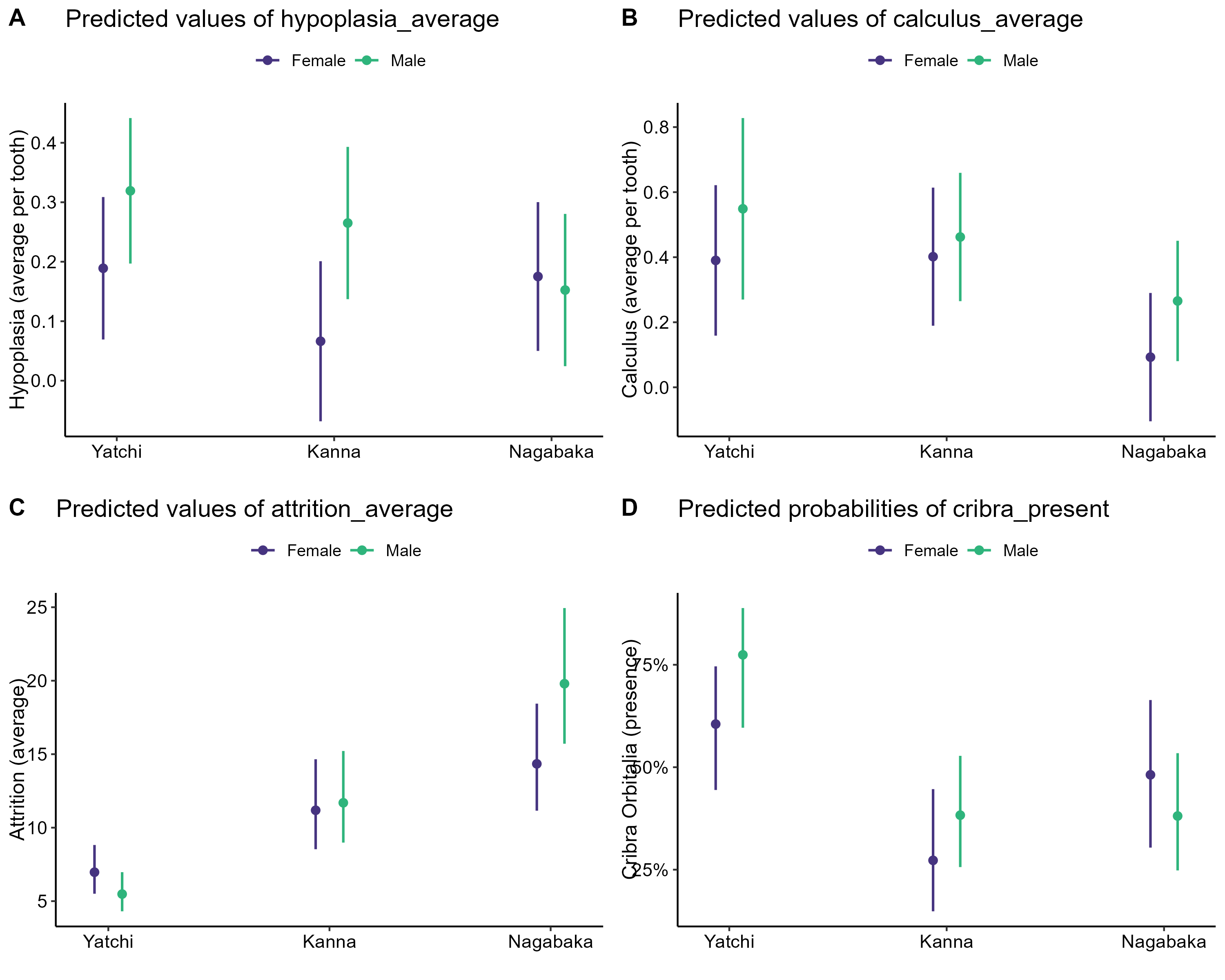 Figure 1. Predicted values (marginal effects) from GLM models by site and sex. (A) Enamel hypoplasia. (B) Dental calculus. (C) Dental attrition. (D) Cribra orbitalia.