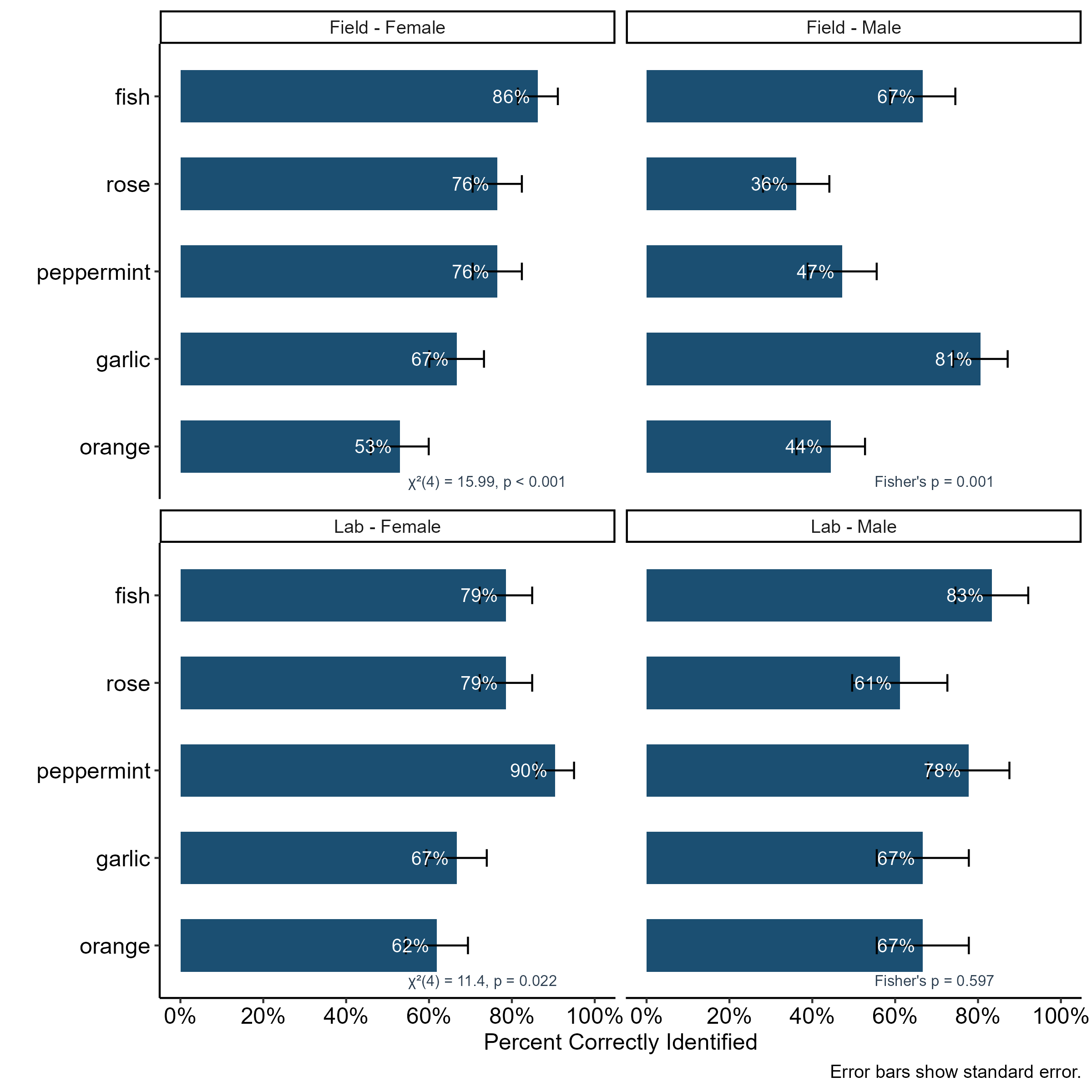 Figure 1. Percent correctly identified by odor, faceted by Study x Sex. Fish was most reliably identified; orange was most difficult. Odor order based on field female accuracy (low to high).