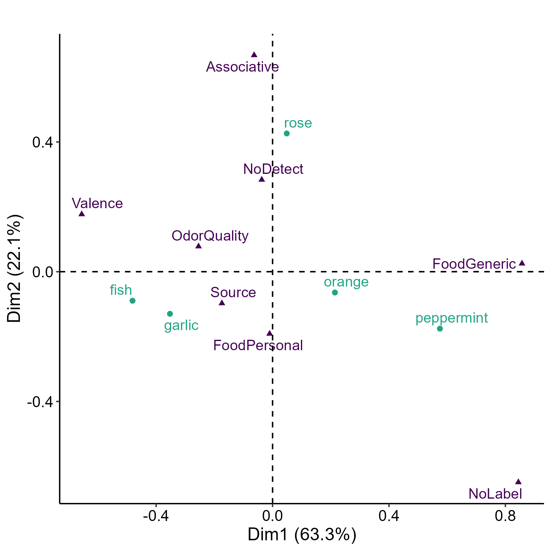 Figure 3. CA biplot (Dim1=63.3%, Dim2=22.1%). Dim1 separates easily-named odors (fish, garlic – Source-dominant) from category-level responses (peppermint, orange – FoodGeneric, NoLabel). Dim2 separates personal/associative (rose) from food-context (fish, garlic).