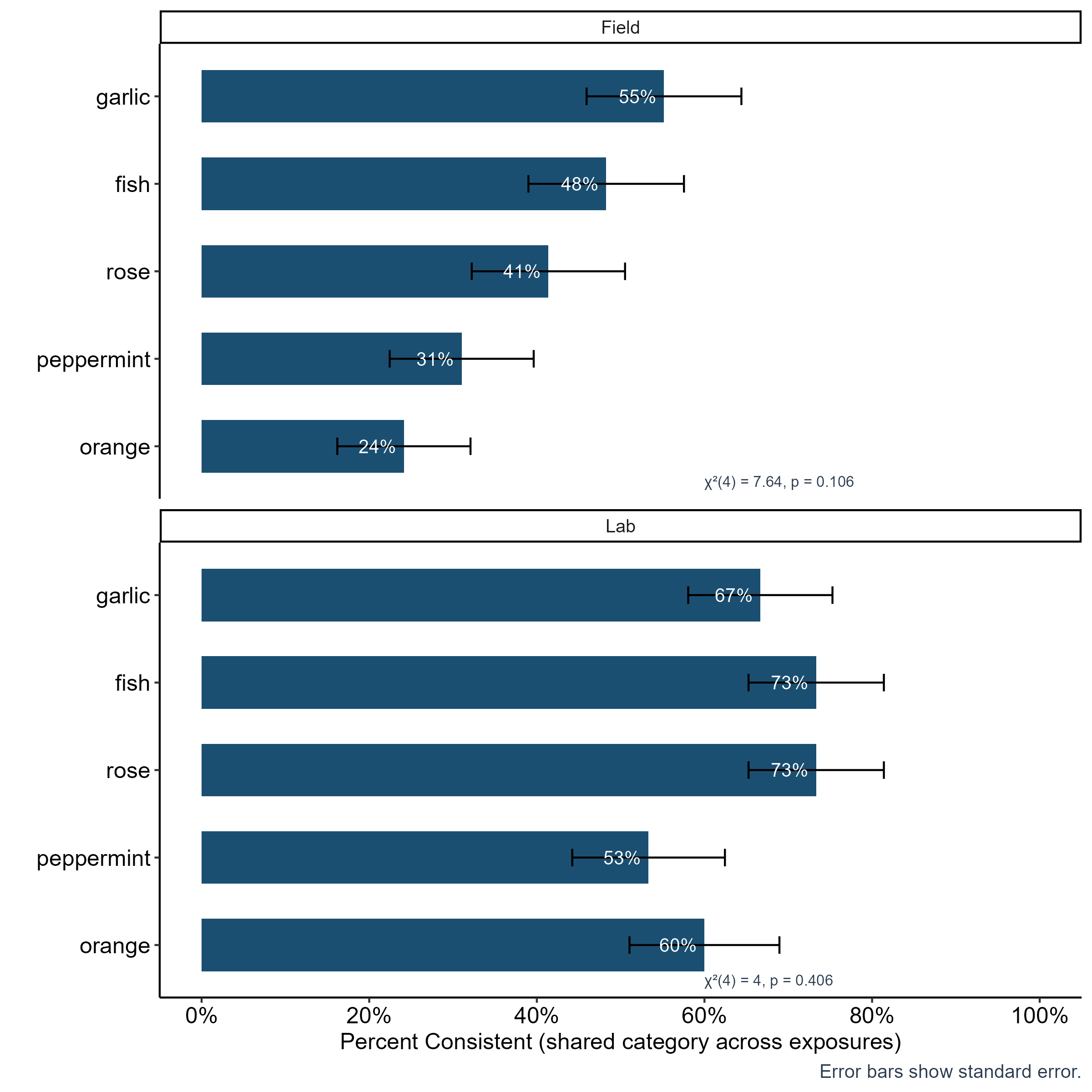 Free-choice consistency (sharing >=1 code category across all exposures) showed no significant odor variation (field chi2=7.6, p=0.11; lab chi2=4.0, p=0.41). Lab participants were more consistent overall (53–73% vs field 24–55%), matching the significant Study effect in the preliminary GLM.