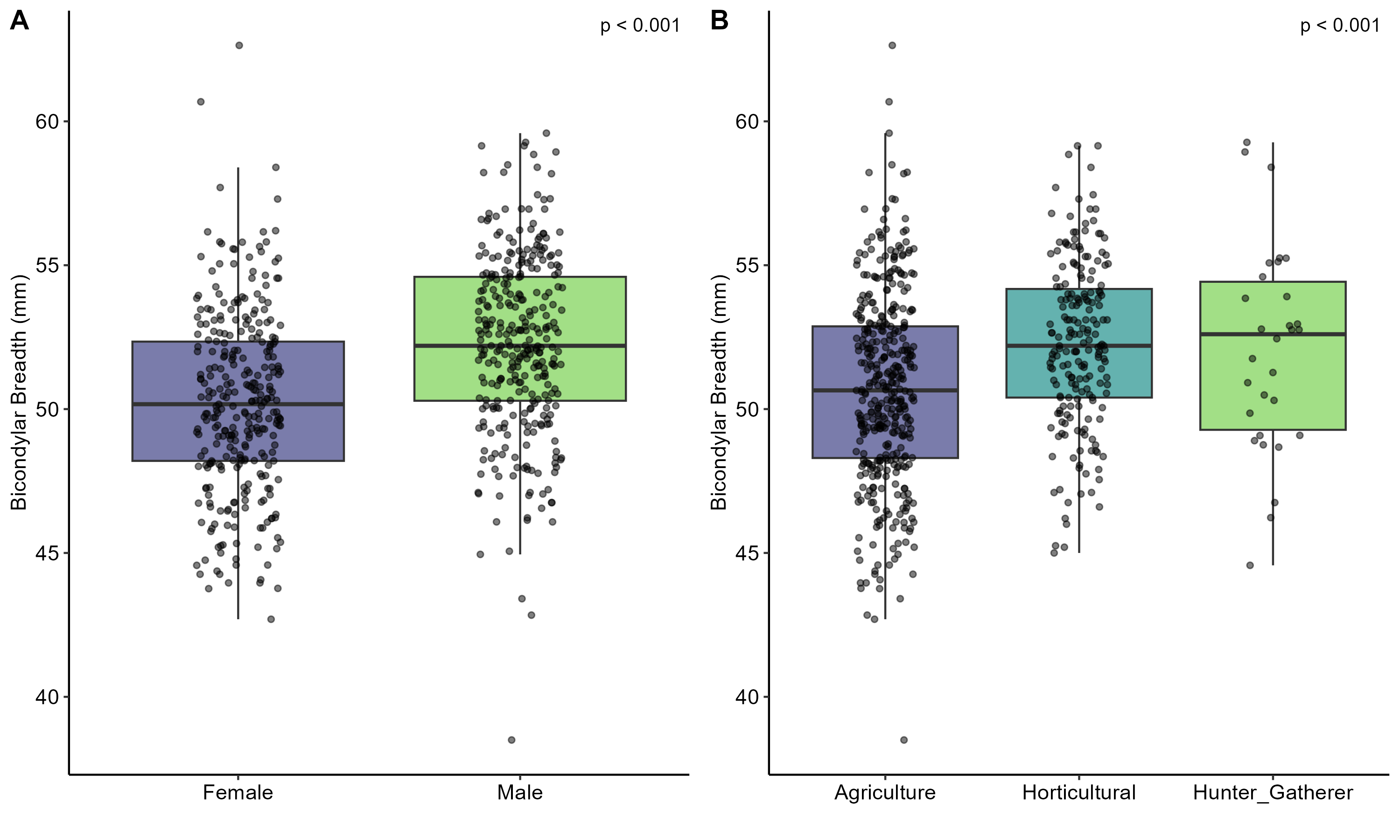 - Horticulturalists and hunter-gatherers both exceeded agriculturalists on bicondylar breadth; the horticulturalist vs. hunter-gatherer difference was negligible (Tukey HSD p=0.95)