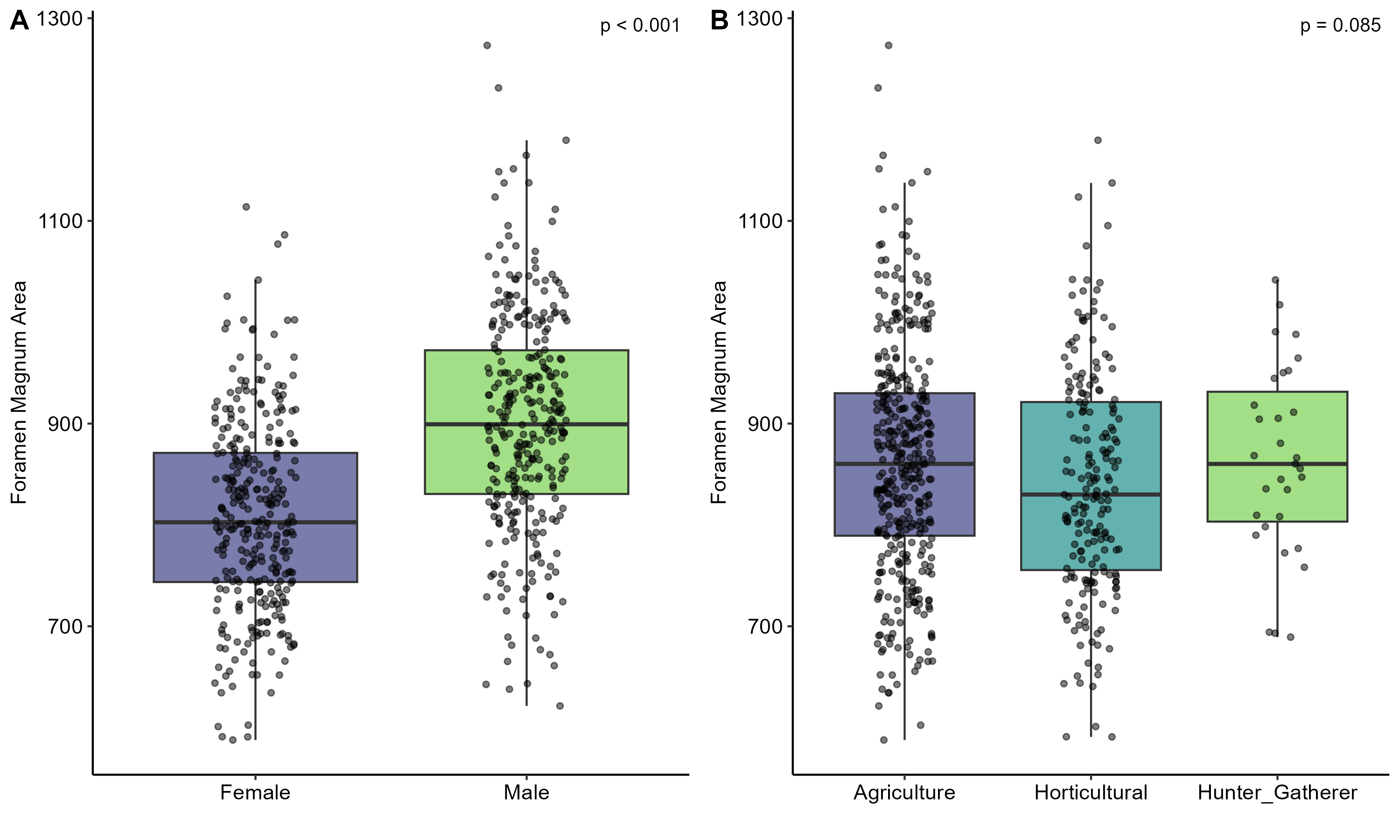 Figure 1A–B. Foramen magnum area by sex (A) and subsistence (B). Significant sex dimorphism; no subsistence effect.