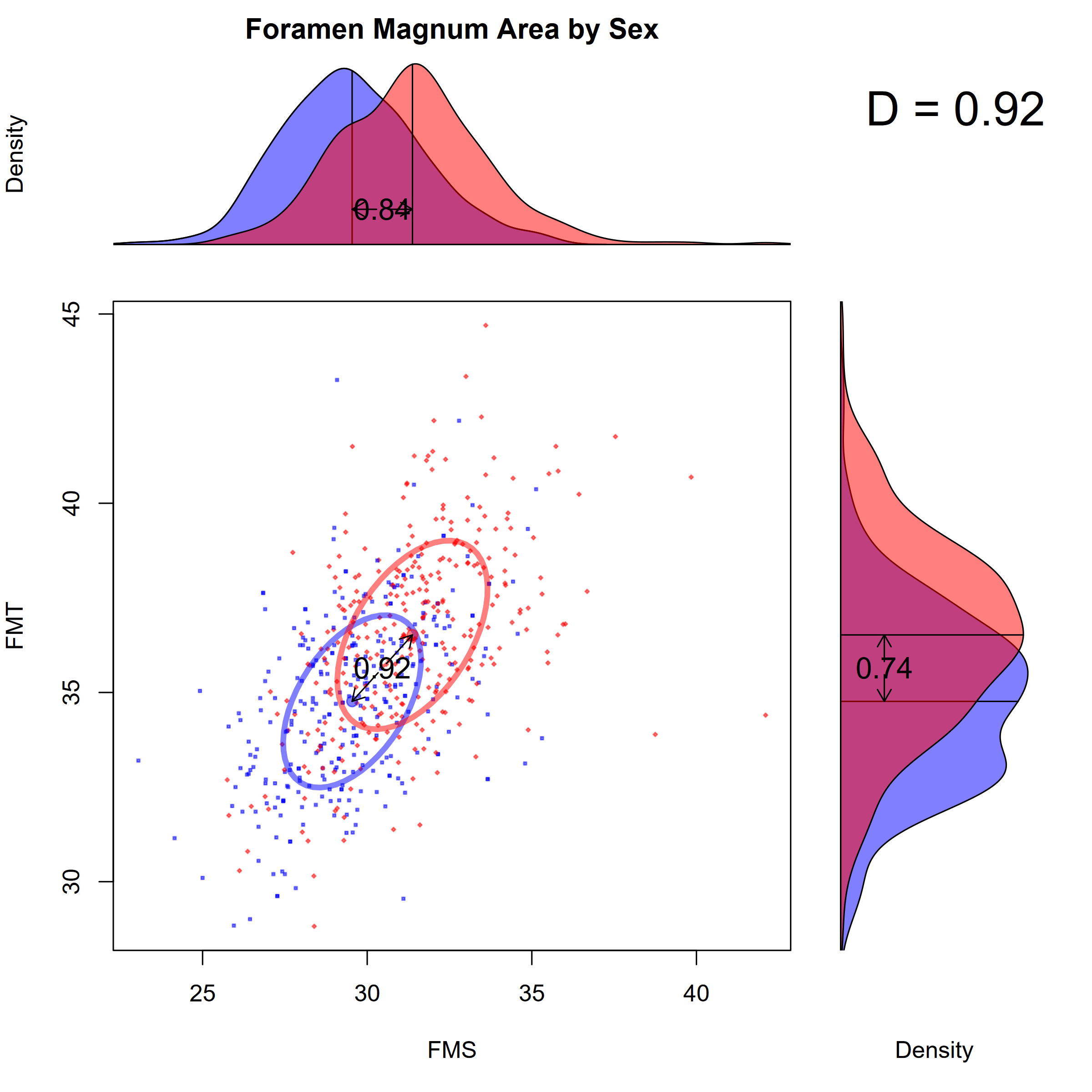 Figure 2. Foramen magnum dimensions (FMS × FMT) by sex. D=0.92; substantial overlap despite significant dimorphism.