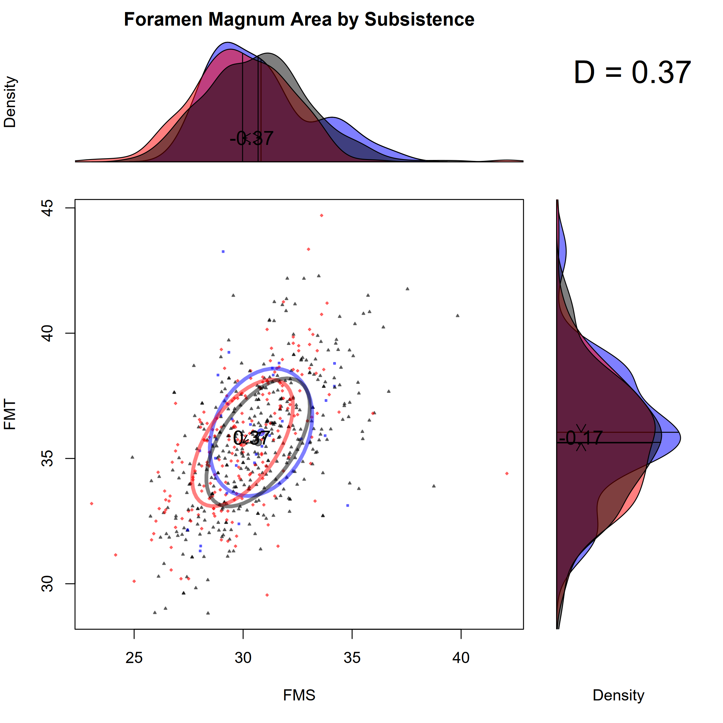 The bivariate relationship between foramen magnum sagittal (FMS) and transverse (FMT) dimensions – the raw measurements combined into the area index – shows the same pattern. Despite statistically significant dimorphism, the D statistic of 0.92 by sex reflects substantial distributional overlap. By subsistence the overlap is even greater (D=0.37), with the three groups nearly indistinguishable.